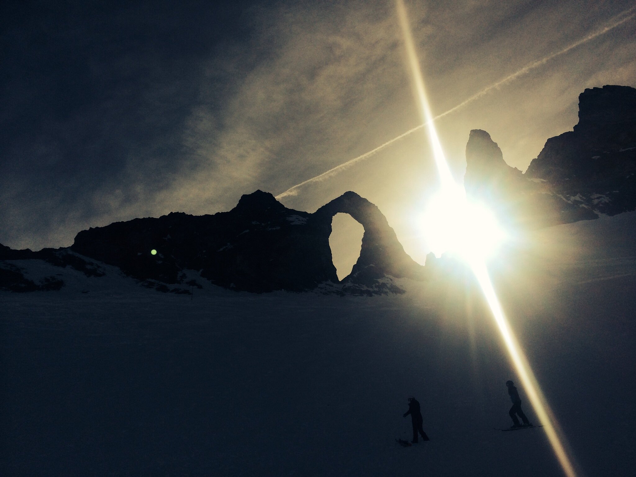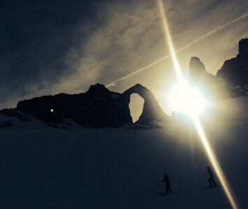 Tignes is the neighbouring resort that makes up the expansive Espace Killy ski area. If you are exploring Tignes be sure to visit the L’Aguille Percee (eye of the needle) the striking rock formation sitting at 2800m and the perfect picture spot.