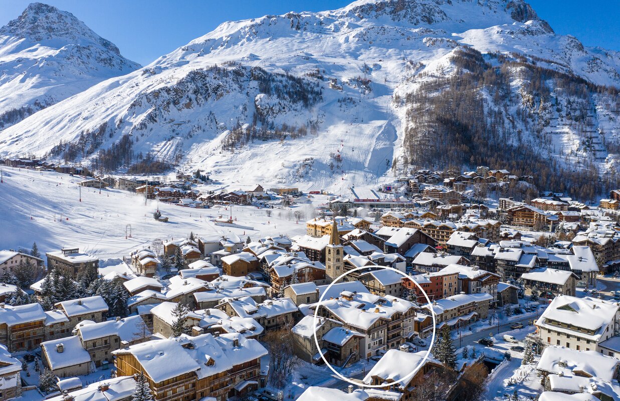 Tucked in between the chapel and the church in the historic centre of Val d’Isère, 100m from the Tourist Office and High Street and only 150m from the edge of the piste. (Registration No. 73304 000956 OP).