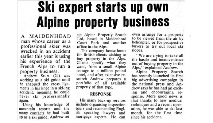 Andy skied a bit and saved £1000 from organising ski races and torchlight descents and took it to Barclays who lent him another £5000. He bought a typewriter and fax machine and rented an office in the Alps.